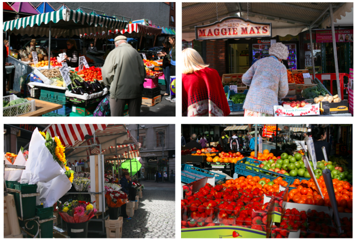 This was a fun street to walk down. Monday through Saturday the street is lined with stalls selling fruit, vegetables, flowers and more. The permanent shops along the street range from local Irish butchers to many asian/african shops. The day we were there they were shooting a TV show in the street that was drawing a crowd, but I think that the popularity of this street makes it a busy street no matter what. Beware of the cobble stones, they are very uneven and can be slippery. http://goireland.about.com/od/shopping/gr/moore_street.htm